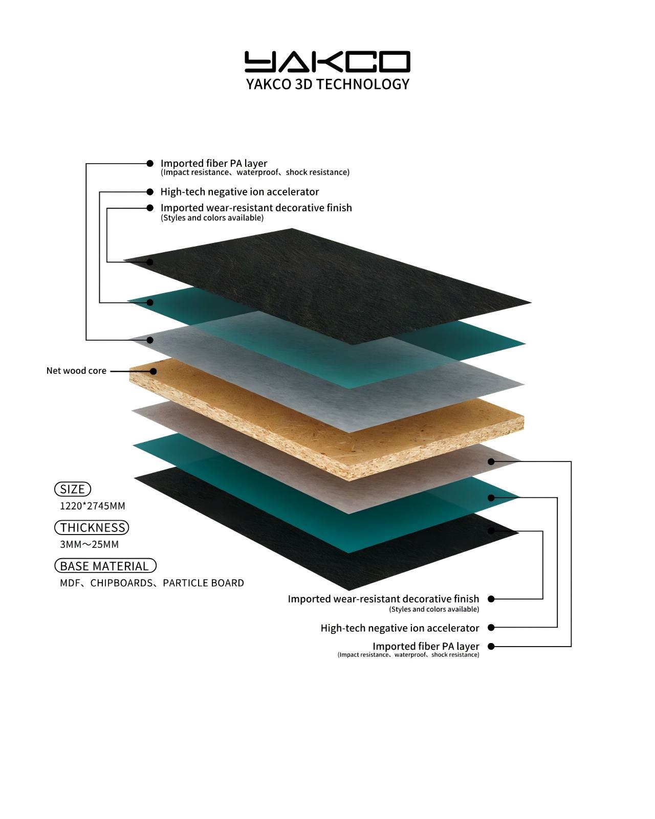 কাঠের শস্য বা পাথরের নিদর্শন, বা বিমূর্ত জ্যামিতিক নিদর্শন এবং শৈল্পিক টেক্সচারের মতো প্রাকৃতিক টেক্সচারই হোক না কেন, সবই 3D প্রযুক্তির মাধ্যমে স্পষ্টভাবে রেন্ডার করা যেতে পারে, ডিজাইনারদের বিভিন্ন ডিজাইনের প্রয়োজনীয়তা পূরণের জন্য একটি বিস্তৃত সৃজনশীল স্থান প্রদান করে। এগুলি অন্যান্য অ্যাপ্লিকেশনগুলির মধ্যে অভ্যন্তরীণ দেয়াল, পার্টিশন সজ্জা, আসবাবপত্র এবং ক্যাবিনেটের পৃষ্ঠতলের জন্য ব্যবহার করা যেতে পারে।